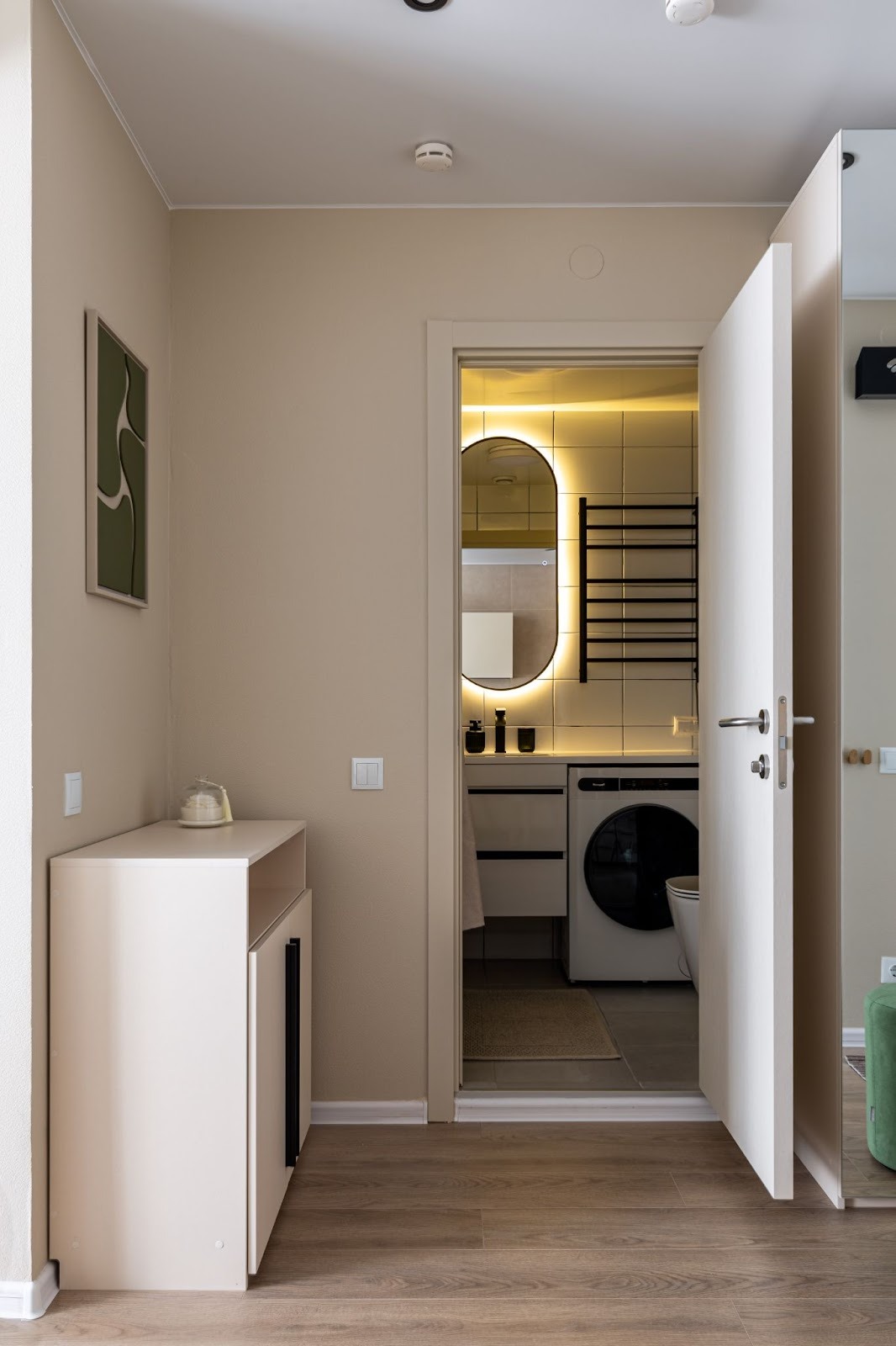 Стены оставляем нейтральными, а акцент делаем на мебели — шкафах, тумбах и комодах.