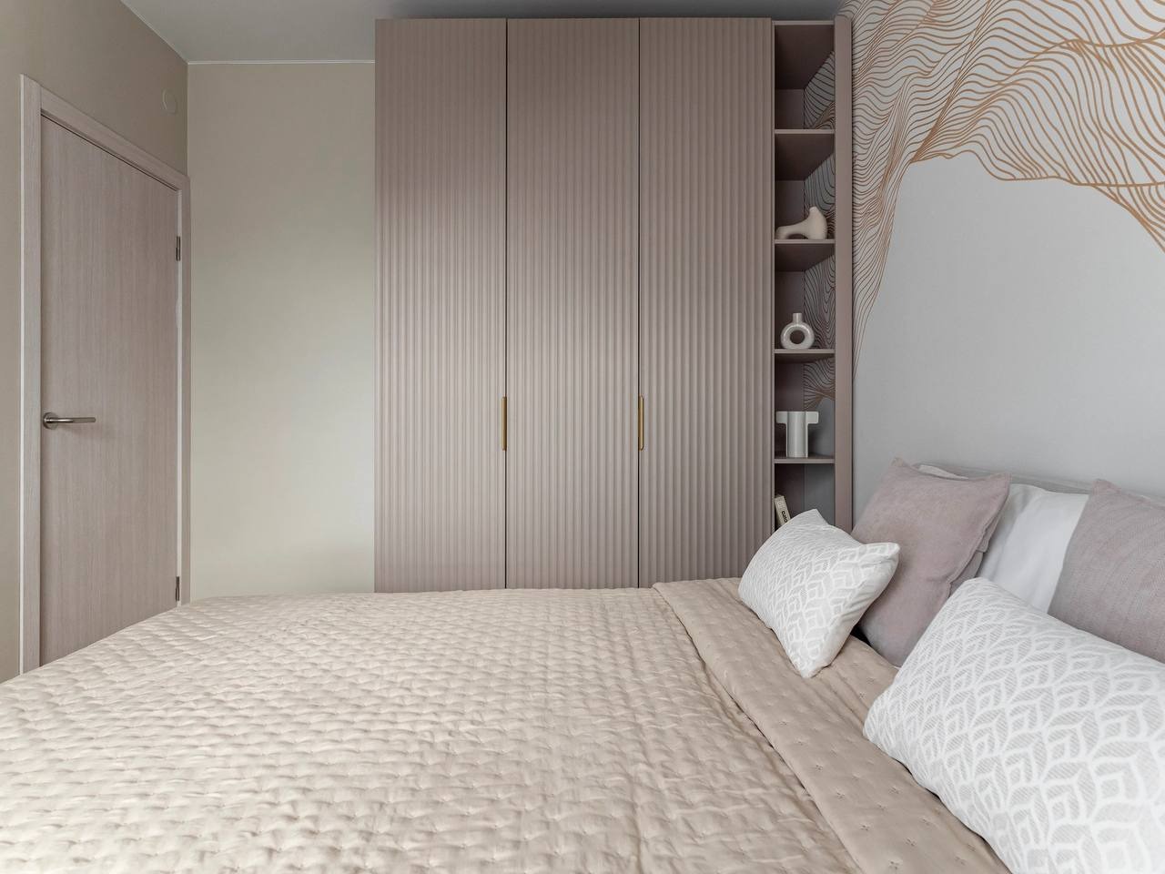 ❗ Совет от Анны Сусловой: если в спальне не хватает места для прикроватной тумбы между кроватью и шкафом, сделайте открытый стеллаж Монс. У «Вереск» его можно выполнить в том же цвете и материале, что и корпус шкафа — решение выглядит цельно и не утяжеляет пространство.