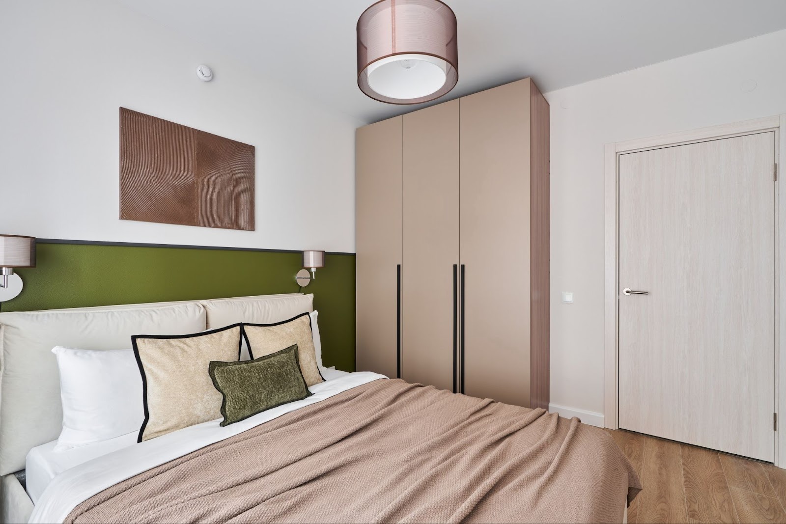 Прикроватную зону логично дополнять тумбами, выполненными в одном цвете или материале со шкафом, чтобы интерьер не дробился.