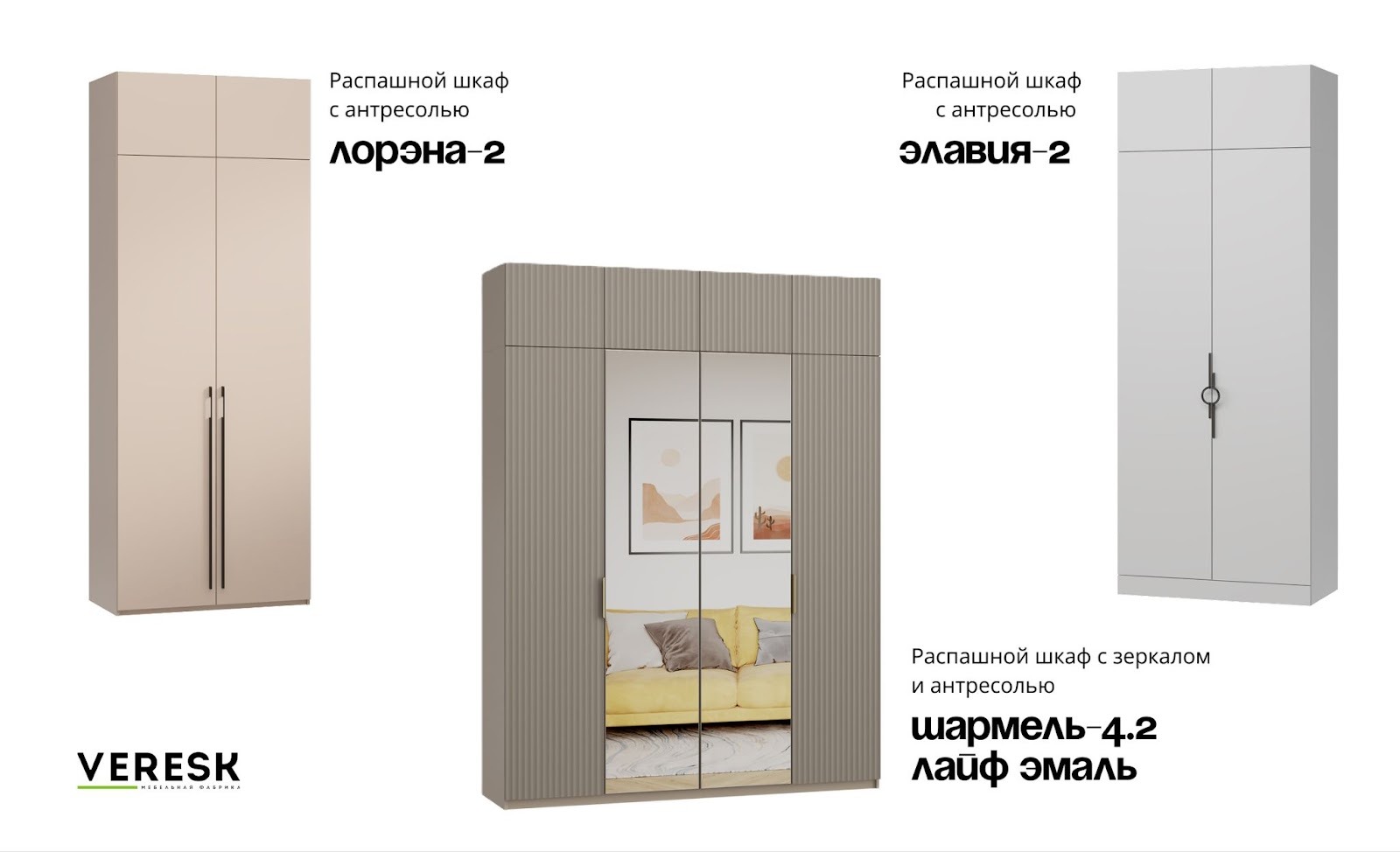 У «Вереск» есть возможность сочетать цвет корпуса и фасада из каталога, что помогает адаптировать мебель под конкретный интерьер и избежать стандартных, шаблонных вариантов.
