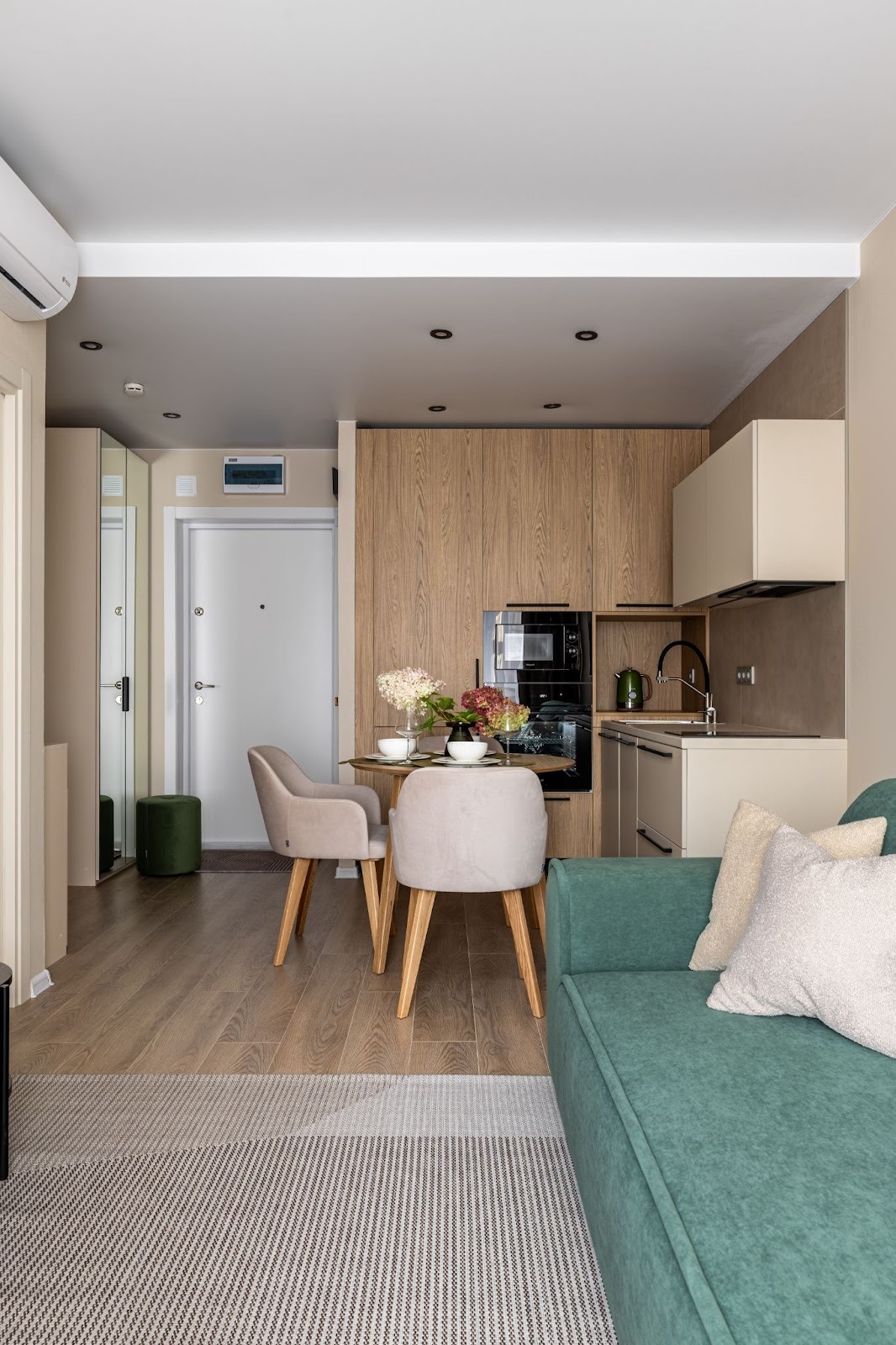 В студиях, возможно, придется пожертвовать размещением полного набора бытовой техники: я часто отказываюсь от духового шкафа в пользу ящика для хранения. И ещё, пожалуй, стоит отказаться от больших напольных сушилок для белья в пользу компактных или настенных вариантов, а для постельного белья купить стиральную машину с функцией сушки.”