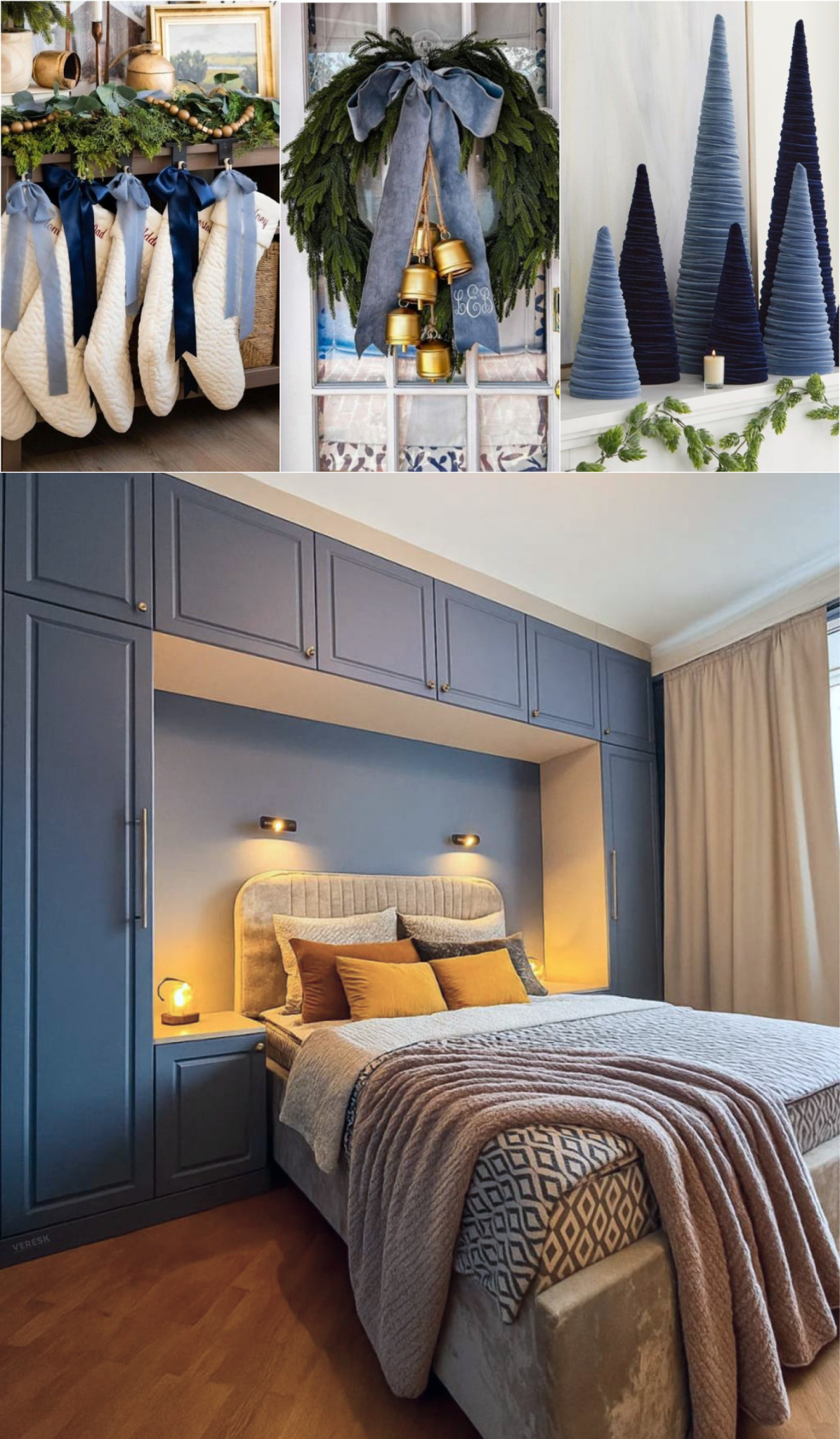 Даже без комода и второго шкафа всё поместилось — пространство получилось цельным и спокойным. Для уюта мы бы добавили в спальню трикотажные ёлочки на подоконник и венок с голубыми акцентами 🩵