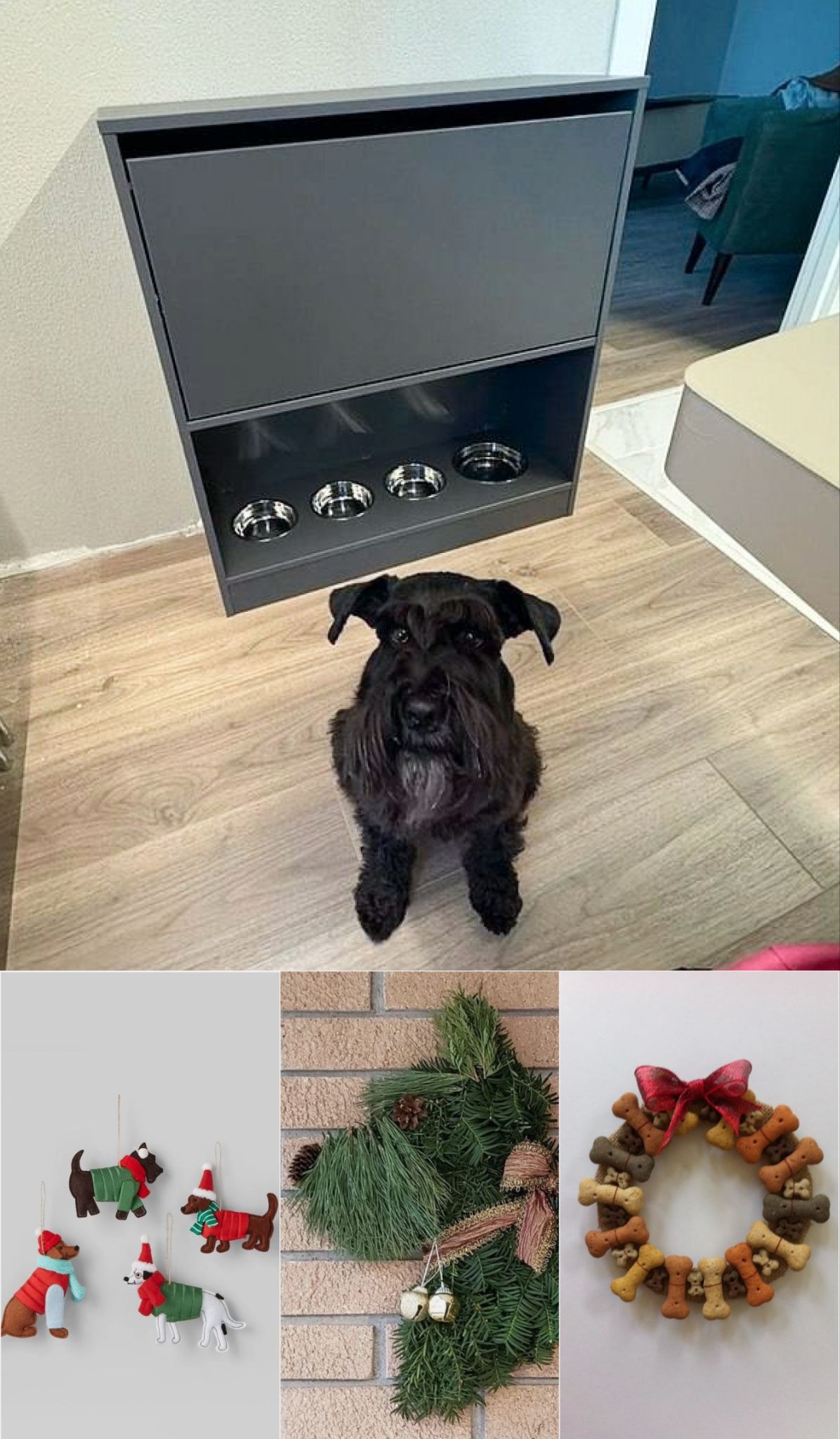 Для декора этой зоны мы бы добавили венок из «косточек», ёлочные игрушки в виде собачек и панно из хвойных веток — чтобы сразу было понятно, кто в этом доме самый хороший мальчик 🐾
