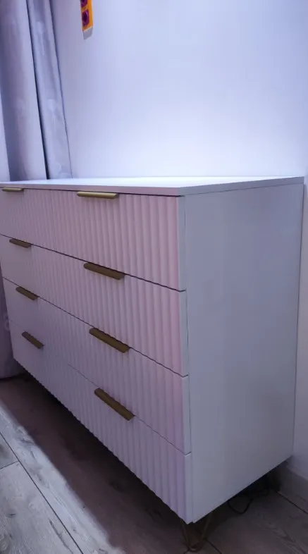 Восторг, а не комод. Белоснежные изящные фасады, фурнитура работает плавно, открываются ящики полностью, ножки кажутся на фото тонкие, на самом деле металл прям уверенный по прочности. Комод супер устойчивый. Довольны очень, так как хотели что-то необычное и качественное. Оправдал свою цену на все сто. Спасибо!