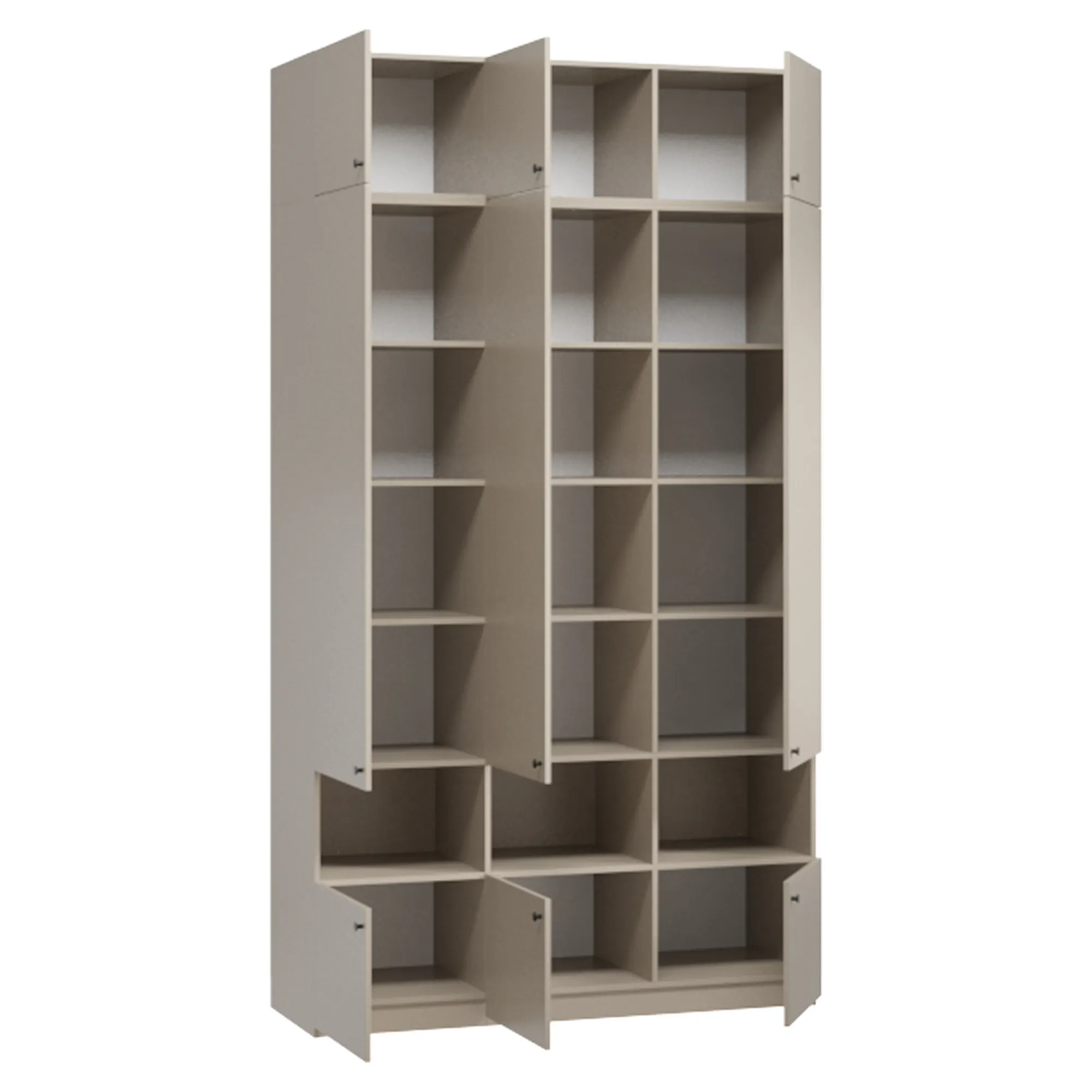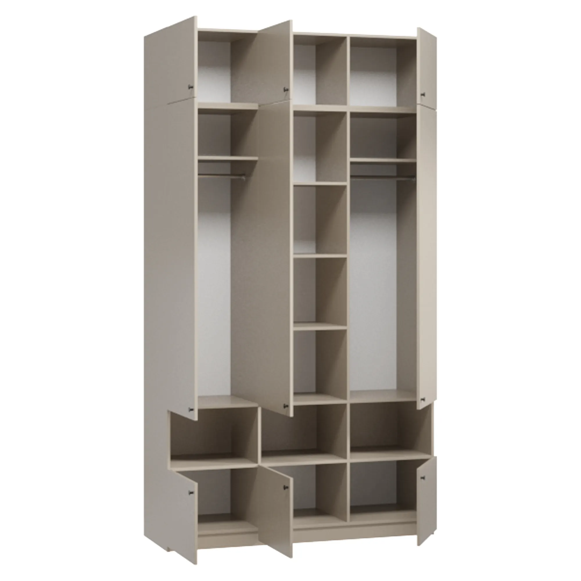 Ручки-кнопки не создают излишней сложности в дизайне и удобны в использовании. Для нужных мелочей и предметов декора предусмотрены открытые ниши. Комплекты постельного белья и сезонные вещи удобно расположить на верхних и нижних полках. В трех платяных отделениях встроены крепкие штанги для курток, костюмов и прочей повседневной одежды. Закрытое основание препятствует скапливанию пыли и облегчает процесс уборки.