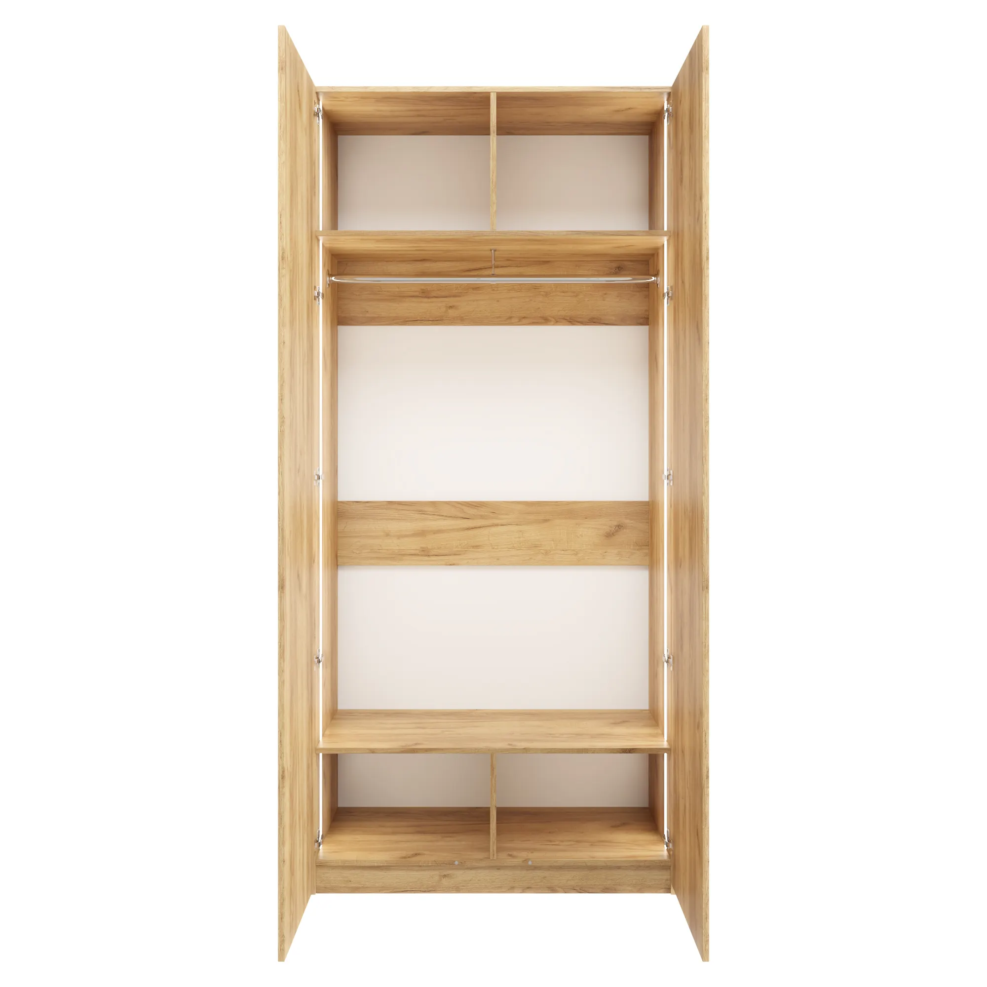 В базовую комплектацию входит металлическая штанга, два верхних и два нижних отделения. Система хранения универсальна и подходит как для прихожей, так и спальни. Скрытый цоколь высотой 8 см упрощает уборку и не деформирует покрытие пола.