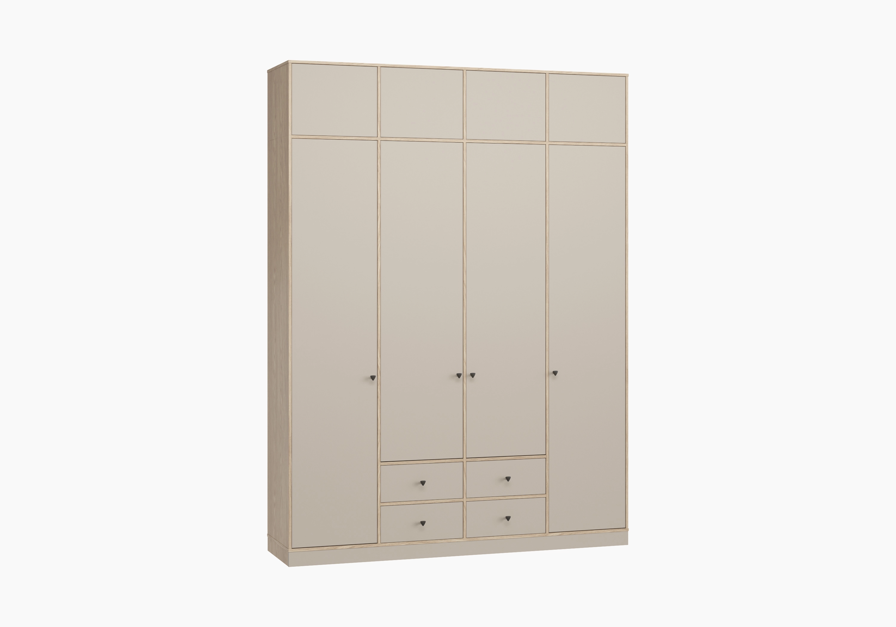 Треугольные ручки-кнопки представлены в трех вариантах: черный, хром и белый. Особенностью коллекции являются вкладные фасады. Антресоль расширяет возможности хранения и открывается с помощью системы push-to-open. Высокий цоколь предотвращает скопление пыли и делает конструкцию более устойчивой.