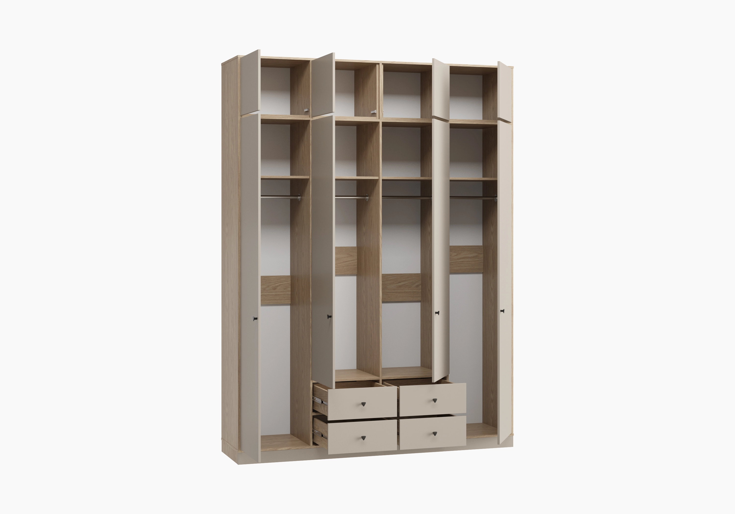 Аккуратное хранение вещей обеспечат четыре встроенные штанги. Сезонные мелочи, сумки и коробки можно разместить на верхних полках.
