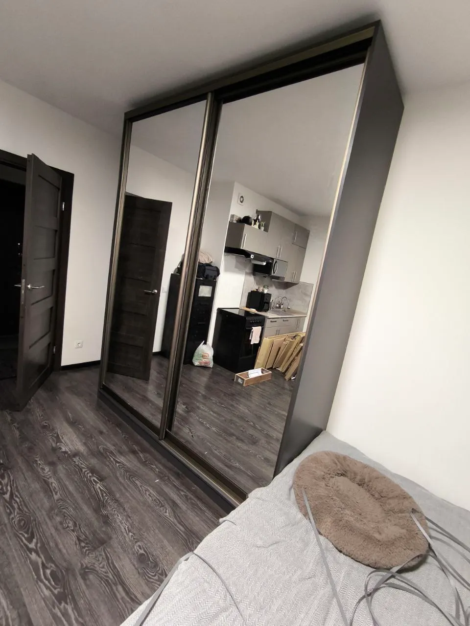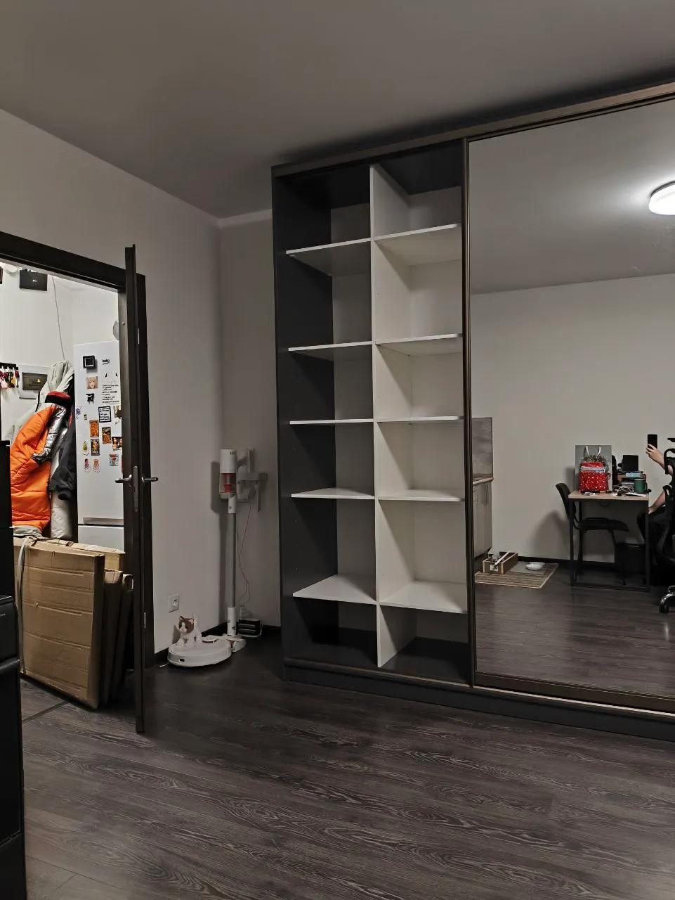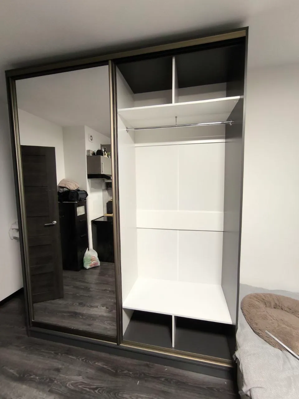 Шкаф-купе Борден-2-5 200х260х65 Схема наполнения 2.7 Цвет корпуса - Графит (оказался слегка темнее, чем думали, но норм), цвет наполнения - Белый, фурнитура - Шампань Отличный конструктор на сайте, выбрали всё, что хотели даже до определённого размера выреза под плинтус! Несколько раз звонили, всё уточняли от деталей заказа, до доставки и сборки. Изготовили и привезли за 3 недели и то, могли управится за 2 недели, сам перенёс позже. Отдельное спасибо за качественную и аккуратную доставку Алексею, профессионал. Также спасибо Антону за качественную сборку! И сервис и шкаф вызвали только положительные впечатления, спасибо, в целом нафоткал основное, прилагаю к отзыву :)