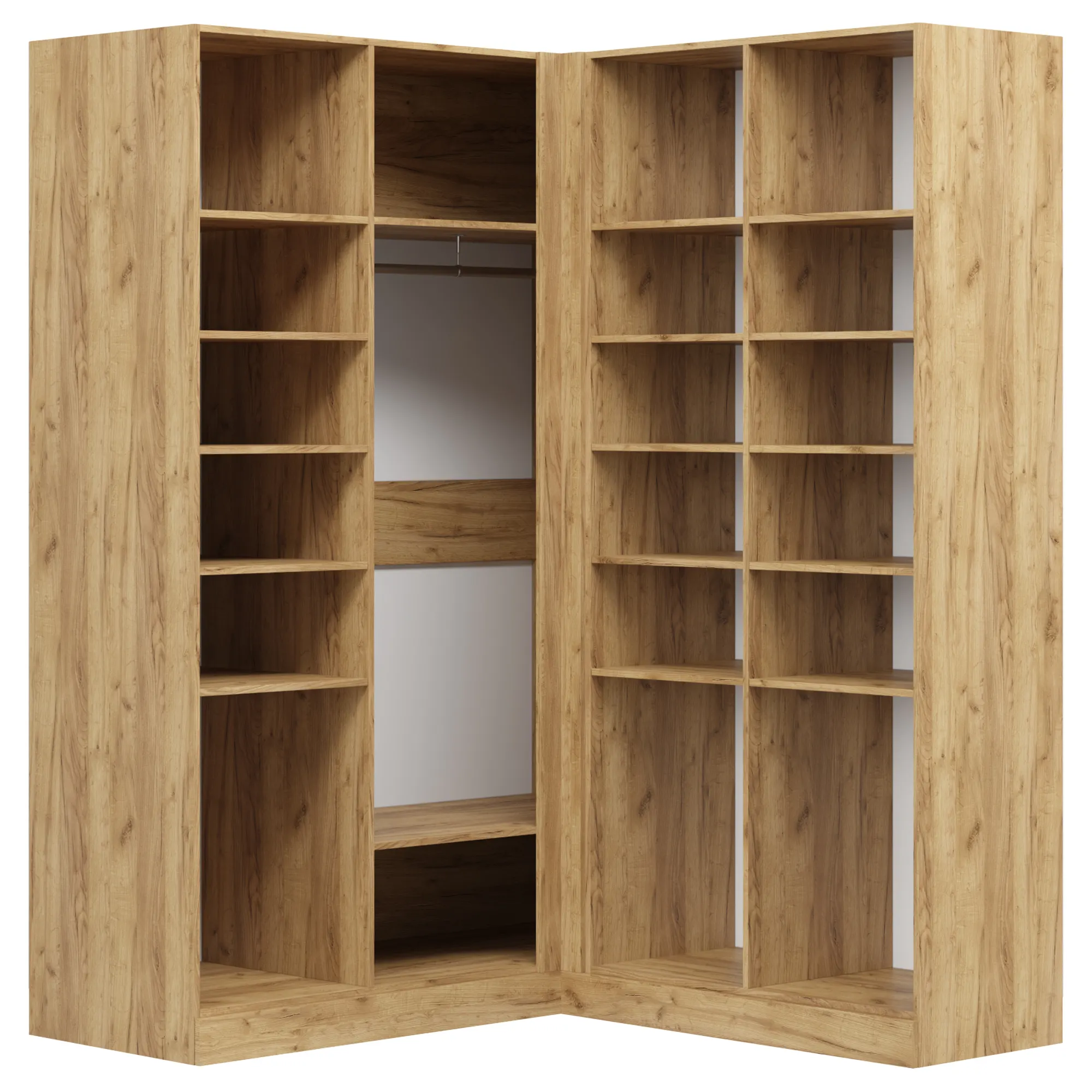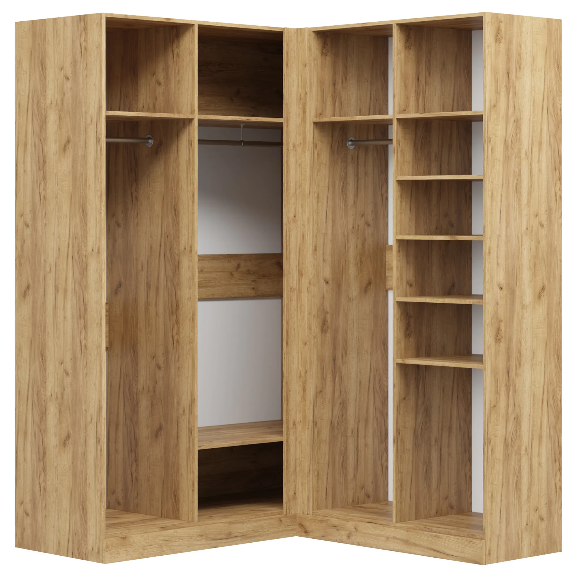 Количество полок, платяных отделений и их положение внутри шкафа можно выбрать самостоятельно. Также есть возможность дополнить конструкцию встроенной беспроводной подсветкой, выдвижными кронштейнами и сетчатыми полками для обуви. Скрытый цоколь упрощает уборку помещения.